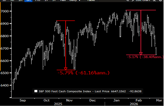 It wasn’t just EM that underperformed last week, as every major non-US geography underperformed the S&P 500, which fell -2.0%: Europe (-6.4 pct), Japan (-8.2 pct), and Emerging Markets (-8.4 pct). Going into March, the S&P 500 was lagging the ROW (Rest of World) by 10%, and after last week, the gap narrowed to just under 5%. The Nasdaq was also a relative outperformer (-1.2% vs. the S&P 500 -2.0%) as the narrative of AI displacing software went on a sabbatical with the iShares Expanded Tech Software Sector ETF (IGV) rallying nearly +8.0% in a down tape (MSFT was up +4.1% on the week).