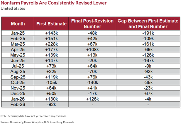 Big picture, I don’t see enough damage yet to shift from the constructive stance we’ve had. Earnings continue to look solid (very little in the way of downward revisions) and inflationary pressures, outside of this spike in oil prices, look like they will continue to be supportive of the Fed pivoting back to a dovish bias later this year. I will say that the jobs report last week was concerning. A decline of -92k jobs in February is not a good number, and we continue to get negative revisions where every single month dating back to January 2025 has been revised lower from the initial estimate. David Rosenberg did the math for us on this front with this graphic in his note this morning (that’s 1.1 million fewer jobs than the initial estimate):
