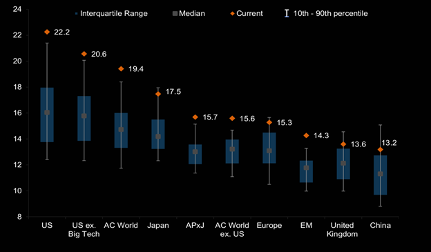 And while I think foreign equity markets continue to be deserving of investors having some capital allocated to them, it’s not as though equities around the globe are trading at a valuation discount. The chart below from FactSet plots the forward P/E multiple across different regions of the world using data from the last 20 years, where every region is trading at a forward P/E above its 20-year median and interquartile range.