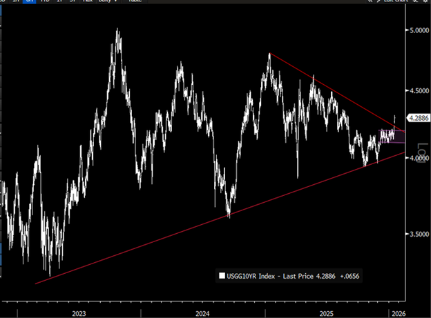 As for markets, the biggest move catching investors' attention is not in equities or even precious metals, but rather in the Japanese bond market, where the 30-year yield has soared +27 basis points to 3.85%. Japan’s super-long 40-year bond yield has pierced the 4.0% threshold for the first time since its debut in 2007. The move in JGB yields isn’t driven by tariffs or geopolitics, but rather the credibility of Japanese fiscal policy. Since Japan’s recently elected Prime Minister Sanae Takaichi took office in October, longer-term interest rates have jumped +80 basis points, with obvious spillover effects across the globe. This relentless melt-up in JGB yields is applying upward pressure to yields across the globe. The yield on 10-year T-notes was up as much as +6 basis points this morning (4.29%) as rates are clearly breaking out of a two-year trading range (the long Treasury bond yield has spiked +9 basis points and is making a run back to 5%). Should this breakout persist, it will put pressure on the stock market's ability to continue to gravitate higher.