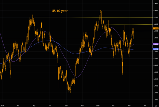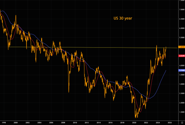 Further out on the curve, the 30-year T-bond is already at recent highs as it pushes up against 5.0%. This is the highest rate on this tenure going back to 2008, and a sustained breakout of this level should start to act as a restraint on further upside for the equity markets.