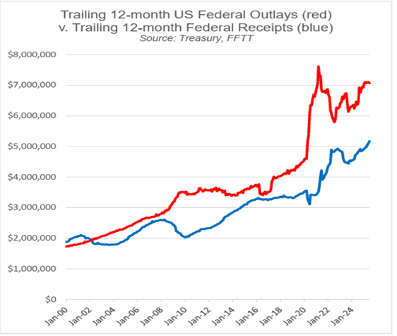 And so with US receipts at all-time highs (blue, below), and with DOGE’s attempt to cut outlays having already failed miserably for both economic AND political reasons…