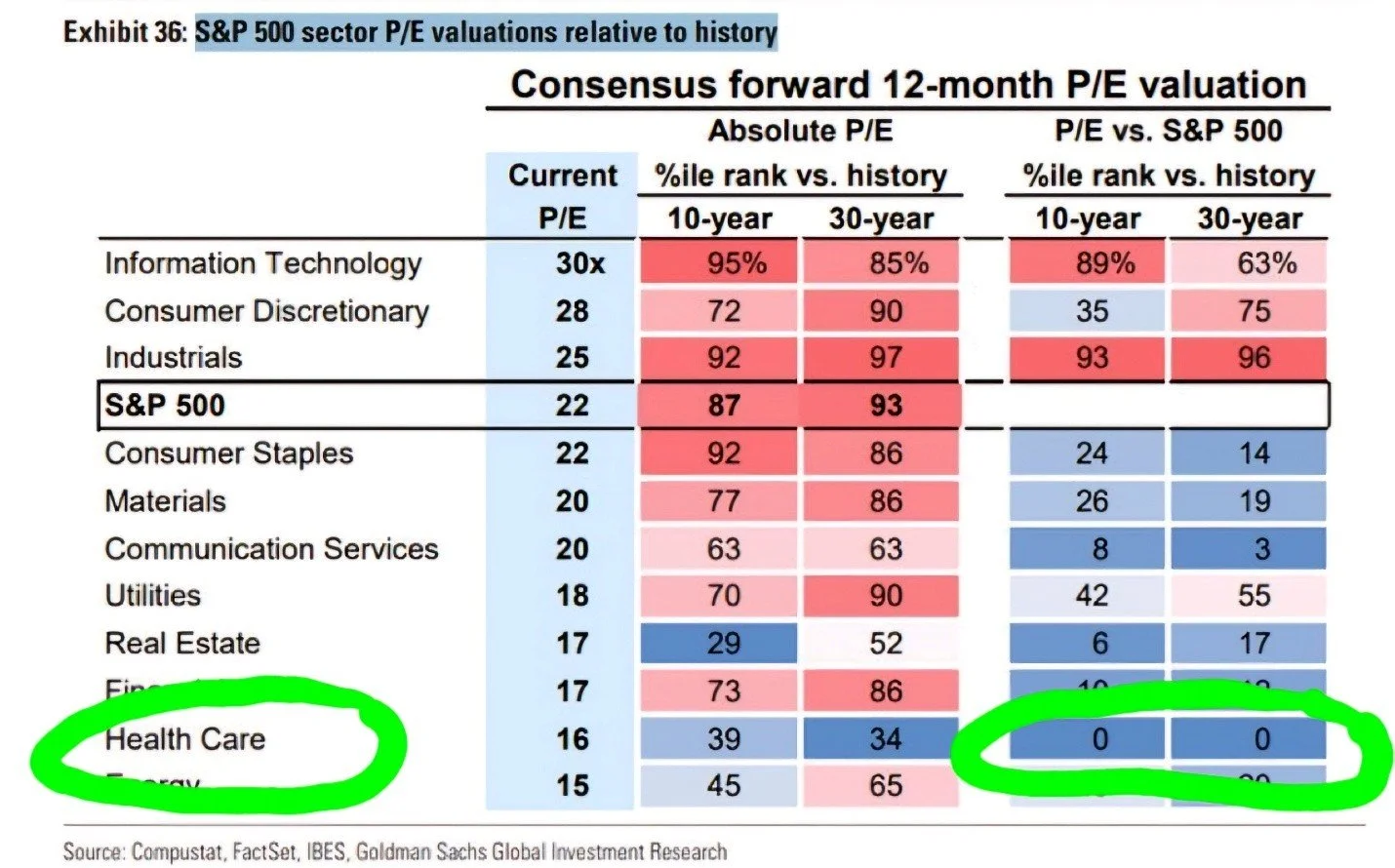 One area in the U.S. equity market that is being left for dead is the healthcare sector (worst-performing sector YTD)—call it pressure from every direction (legislation, pricing, tariffs, and a lack of innovation). However, when an entire sector has historically low valuations relative to the market (0th percentile), it should compel even the most casual market observer to do some work and tip over a couple of rocks (table from Goldman Sachs).