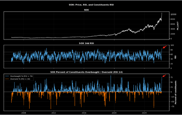 The Tech sector, led by the Mag7 and the semiconductor sector, has been on a tear since the ceasefire was announced. The Nasdaq gained +1.5% last week, which added to its breathtaking +17.5% rally over the past four weeks. Since late March, the Nasdaq Composite has gone from being down nearly -10% on the year to +6.9% as of Friday's close – talk about an about-face. The S&P 500 has also vaulted ahead +12.0% in the past four weeks to fresh record highs and has now swung into the green to the tune of +4.5% on a YTD basis. Few things have been as impressive as the meteoric surge in the SOX index, which has not experienced a single down day in April and is up by an incredible +38% this month alone. The Semiconductor index has now risen in eighteen straight sessions, the longest winning streak since the composite was created back in 1994. From a technical perspective (see RSI readings in the chart below), the sector looks to be getting ahead of itself on a short-term basis, but given the surge in earnings we’re seeing, it's hard to say this move isn’t fundamentally justified.