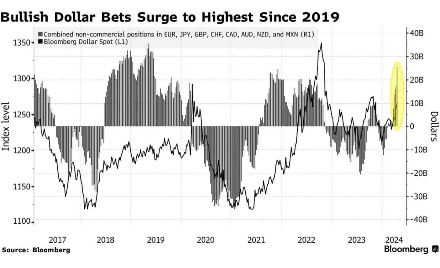 Like yields, a sustained breakout to the upside on the dollar will spell trouble for all risk assets and set off a set of dominos, but also like yields I think the bulk of this move is in the rearview mirror. The year-to-date high in yields and the dollar is being digested and repriced across asset markets. Combine this with the resetting of Fed policy expectations and we’re talking about some major variables that are at the center of what is driving this correction. Have a look at the below chart from Bloomberg highlighting the degree to which bullish bets on the dollar have shifted from the start of the year - non-commercial players were short the dollar at the start of 2024 and are now carrying their largest long exposure going back to 2019).