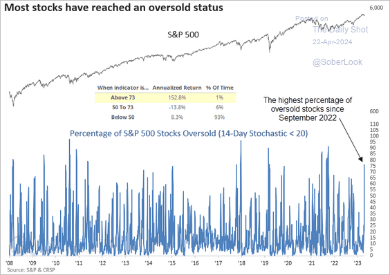 I’m starting to see some signals on my dashboard that suggest we’re approaching the worst of this downturn. No, I’m not arrogant enough to call a bottom or say the correction is over right here right now, but between here (S&P 500 4,960) and 4,750 I’m inclined to be more of a buyer than a seller. Consider that just 6% of the S&P Technology sector stocks are above their 50-day moving average – that’s a pretty washed-out reading. Furthermore, the percentage of S&P 500 stocks registering oversold readings is at the highest level since September 2022 (see below chart from @Soberlook at The Daily Shot).