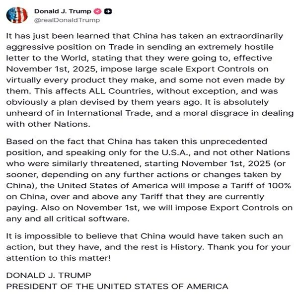 Capital markets were on the receiving end of an abrupt reminder on Friday that the confrontation between the U.S. and China is ongoing when President Trump released the following X post regarding Chinese trade restrictions on critical minerals it controls: