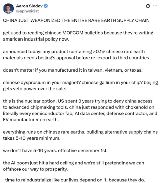 This isn’t to say the U.S. doesn’t have its own leverage points as well, but what I see playing out in real-time is a wake-up call to U.S. policymakers and business leaders, where action needs to be taken to remove how vulnerable and dependent various aspects of U.S. national security have become. We can’t continue to expect China to send us rare-earth magnets to fabricate high-end tech and defense weapons that we could use to fight a kinetic war against them. Not implying it will get to that point, but we can all be pretty confident that it would be a ‘hard no' from China on rare earth shipments well before we got there. I thought the following X post from Aaron Slodov was on point in summarizing the setup:
