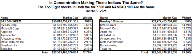 According to our work, the investment themes of AI, U.S. industrial renaissance, power generation, grid electrification, and currency debasement overlap significantly. You do not need to just own the Mag7 names to participate, but keep in mind this street runs both ways. If they are rallying together then it’s reasonable to expect that they will fall together when/if the market experiences some downside volatility. However, I will admit that the AI trade and concentration within the S&P 500 has me a bit nervous. Not that these aren’t some of the strongest and most fundamentally sound businesses the world has to offer, nor that they don’t continue to put up strong numbers. Furthermore, the scale of the data-center expansion is so large that it is stretching the ability of the U.S. to provide enough electricity, backup generators, and other equipment, which is carrying over to the utilities and natural resource markets. But you can’t ignore the fact that the top eight stocks in the S&P 500 and Nasdaq 100 have become identical – one is just more concentrated than the other (table compliments of Jim Bianco).