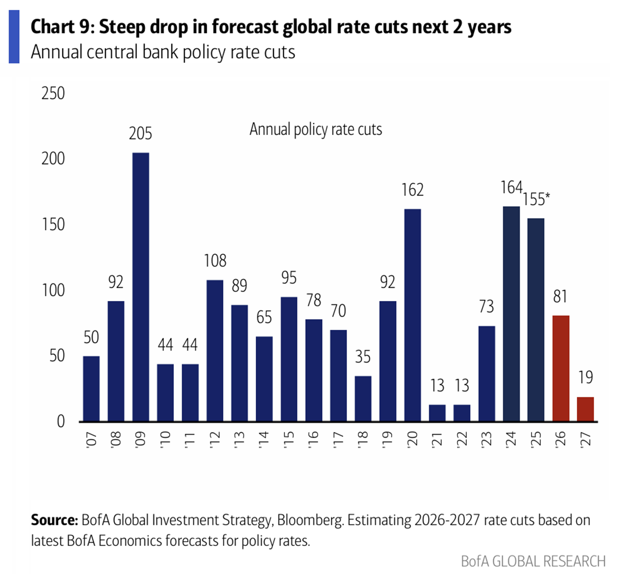 Let me end with some closing thoughts on markets, which unfortunately have me more focused on vulnerabilities than opportunities. No, we have yet to make any dramatic adjustments to portfolio allocations, but we are tweaking around the edges, having pruned lower quality holdings, adding to the quality factor within the equity market, and carrying a bit higher cash position. At the top of mind is the question of whether we have moved past the point of peak liquidity and peak global monetary policy easing. If so, then we have likely experienced the trough for easy financial conditions. The below BofA chart from Michael Hartnett highlights the deceleration in central bank rate cuts from 2024 and 2025 as we head into 2026. Don’t kid yourself, as this mattered for how well risk assets performed over the past 24 months. Another key will be whether the US dollar stays below the $100 level, as it has acted as a big support for the improvement we’ve seen in global markets and economies in 2024/25.